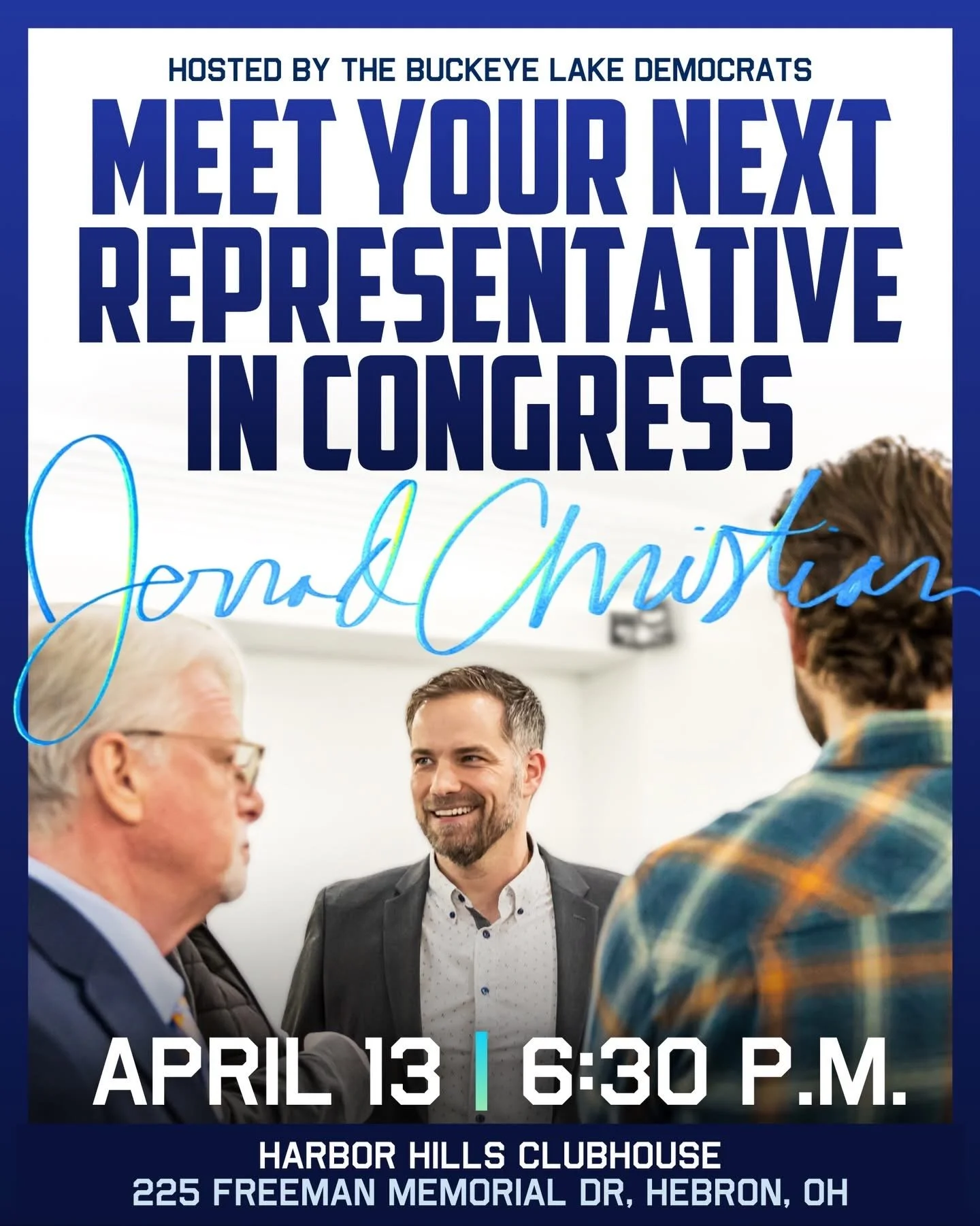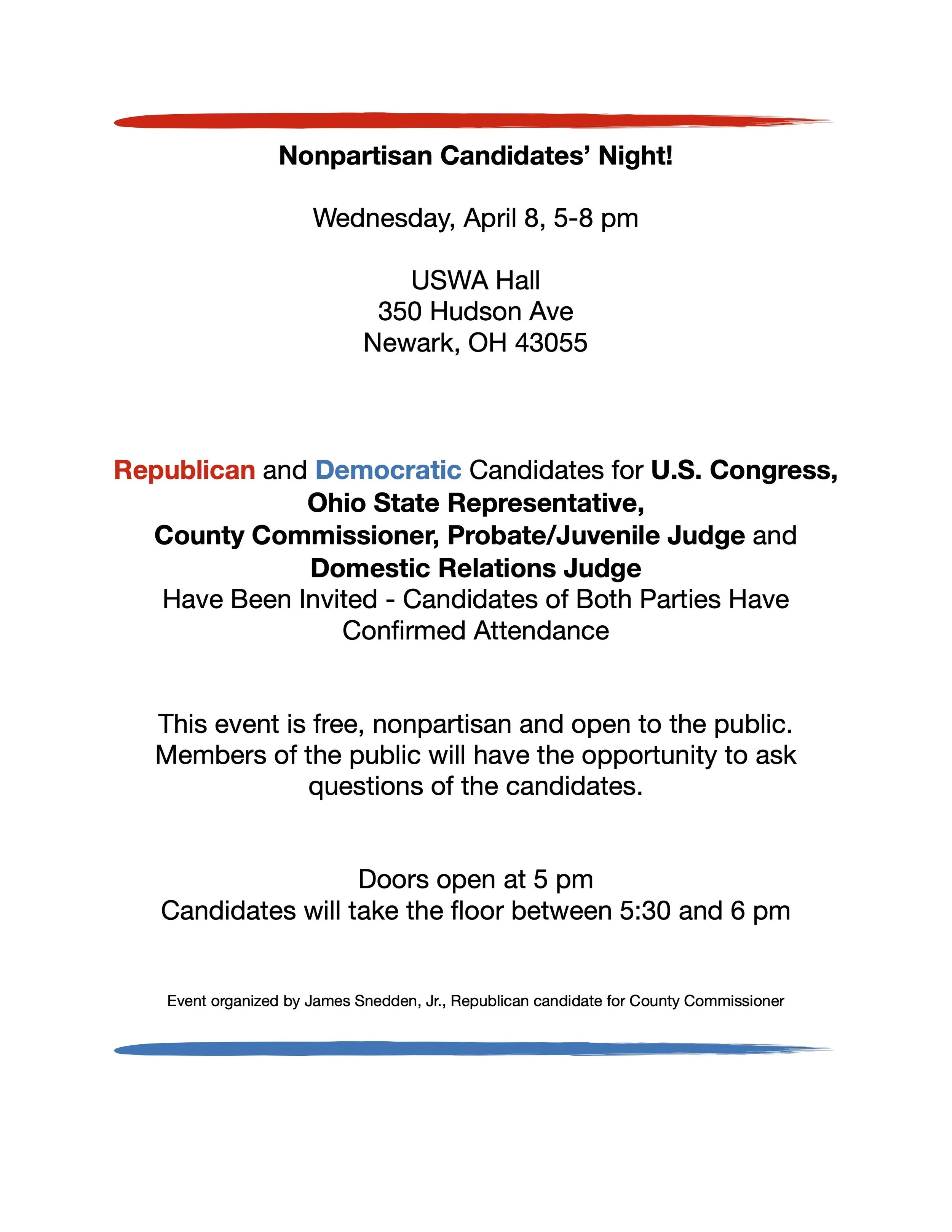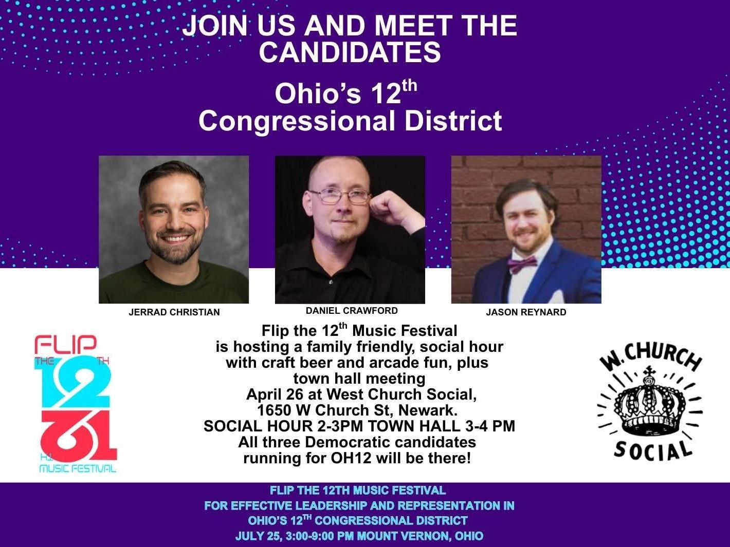 Sunday, April 26, Meet the OH 12th Congressional District Candidates - 2:00-3:00 Social Hr. and 3:00-4:00 Town Hall @ West Church Social, 1650 W. Church St., Newark: